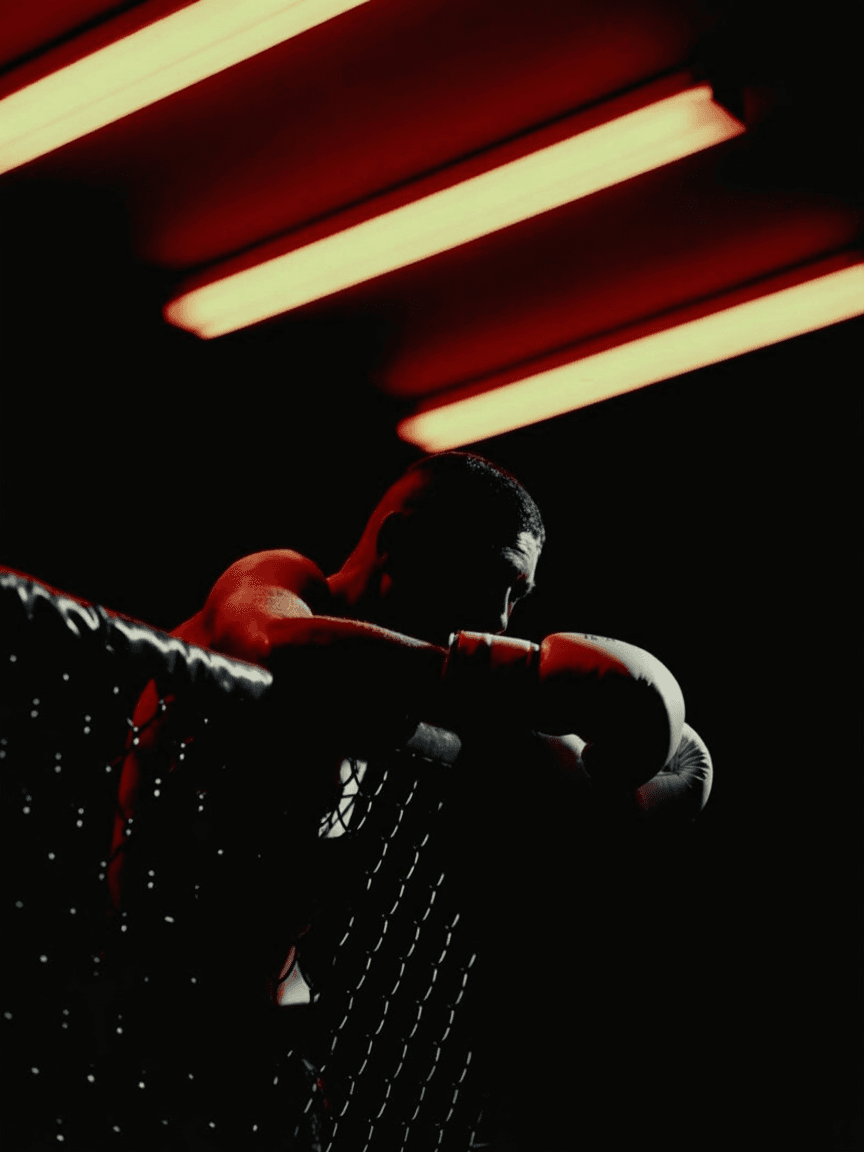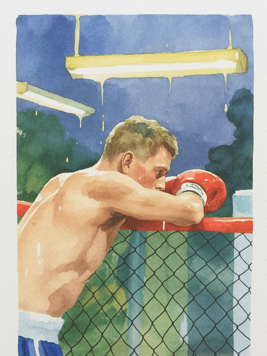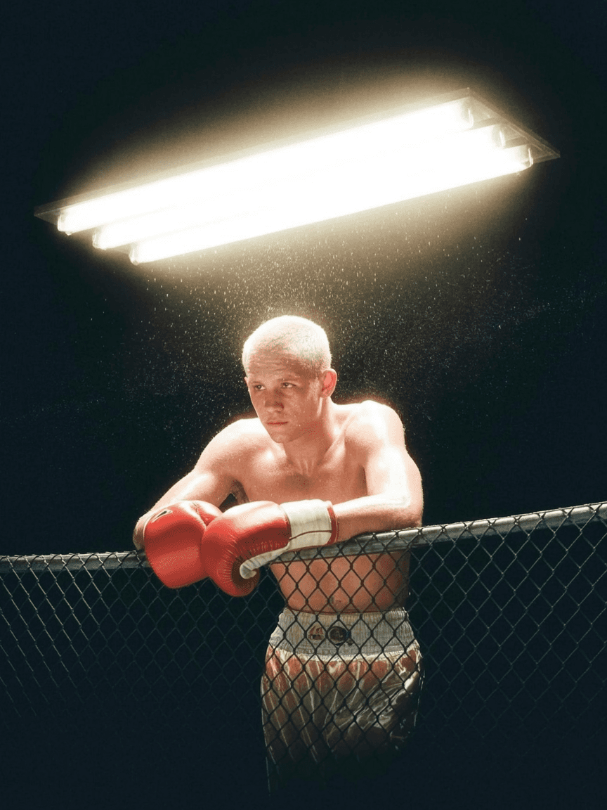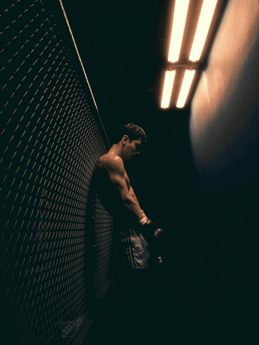 Prompt: Film photo of a boxer leaning against a chain-link fence at night, sweat dripping under buzzing fluorescent lights.