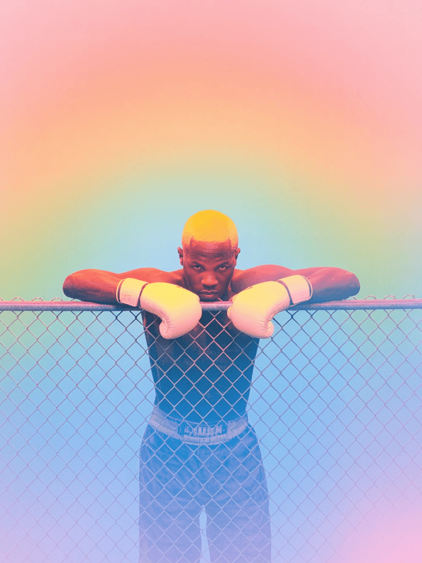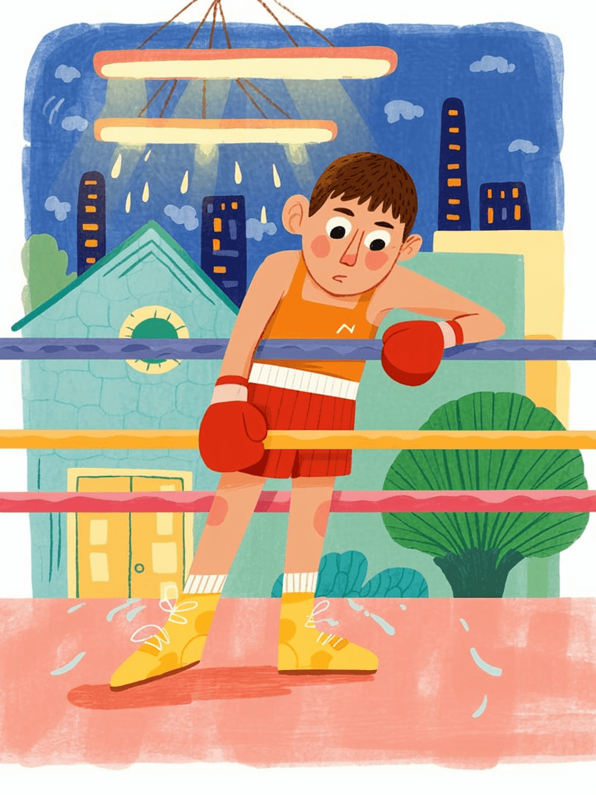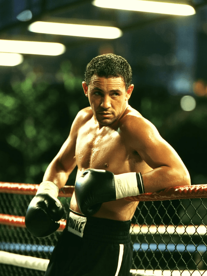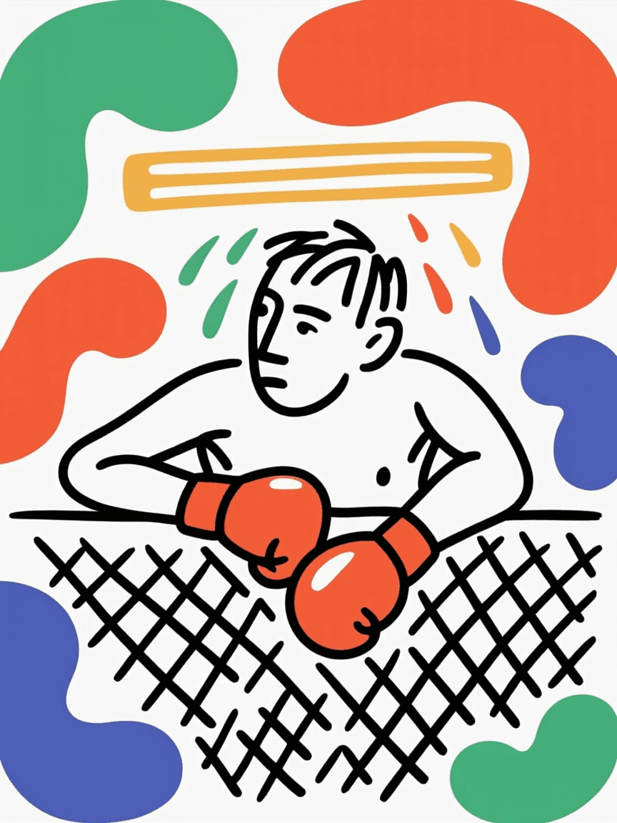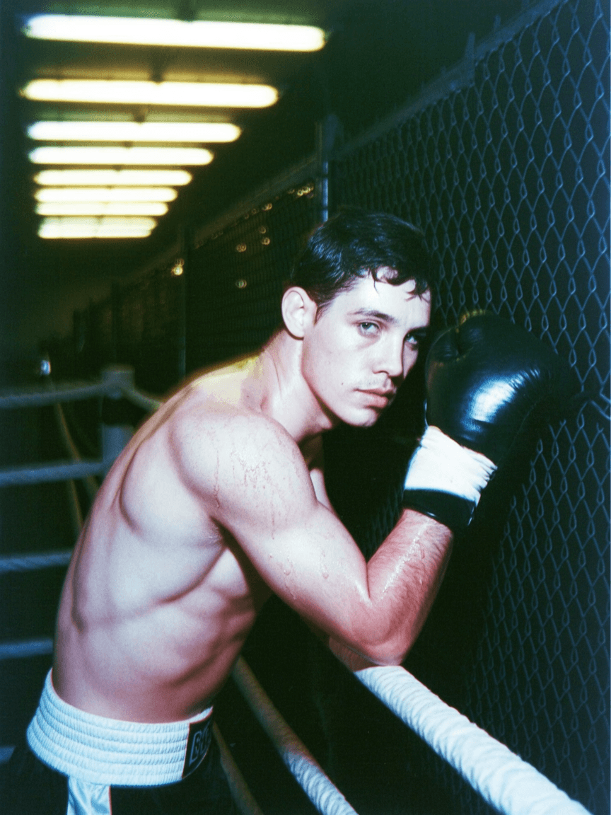 Prompt: Film photo of a boxer leaning against a chain-link fence at night, sweat dripping under buzzing fluorescent lights.